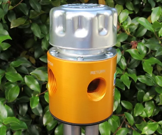 The sample port is located on the side of the ram. A push-to-connect tube fitting is inserted into the interior sampling port to accommodate a 1/4″ OD tube (not supplied). The sampling tube may be attached to either down tube using nylon ties allowing for consistent, safe, easy oil sampling deep within the reservoir.